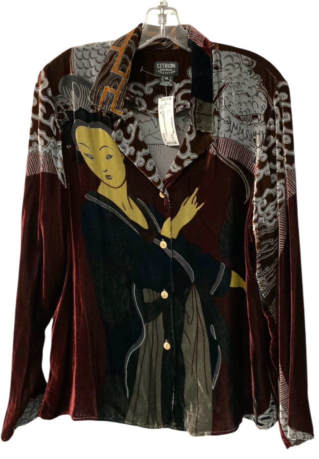 CITRON Merlot/Silver/Teal Asian Inspired Velvet L/S B/D Top