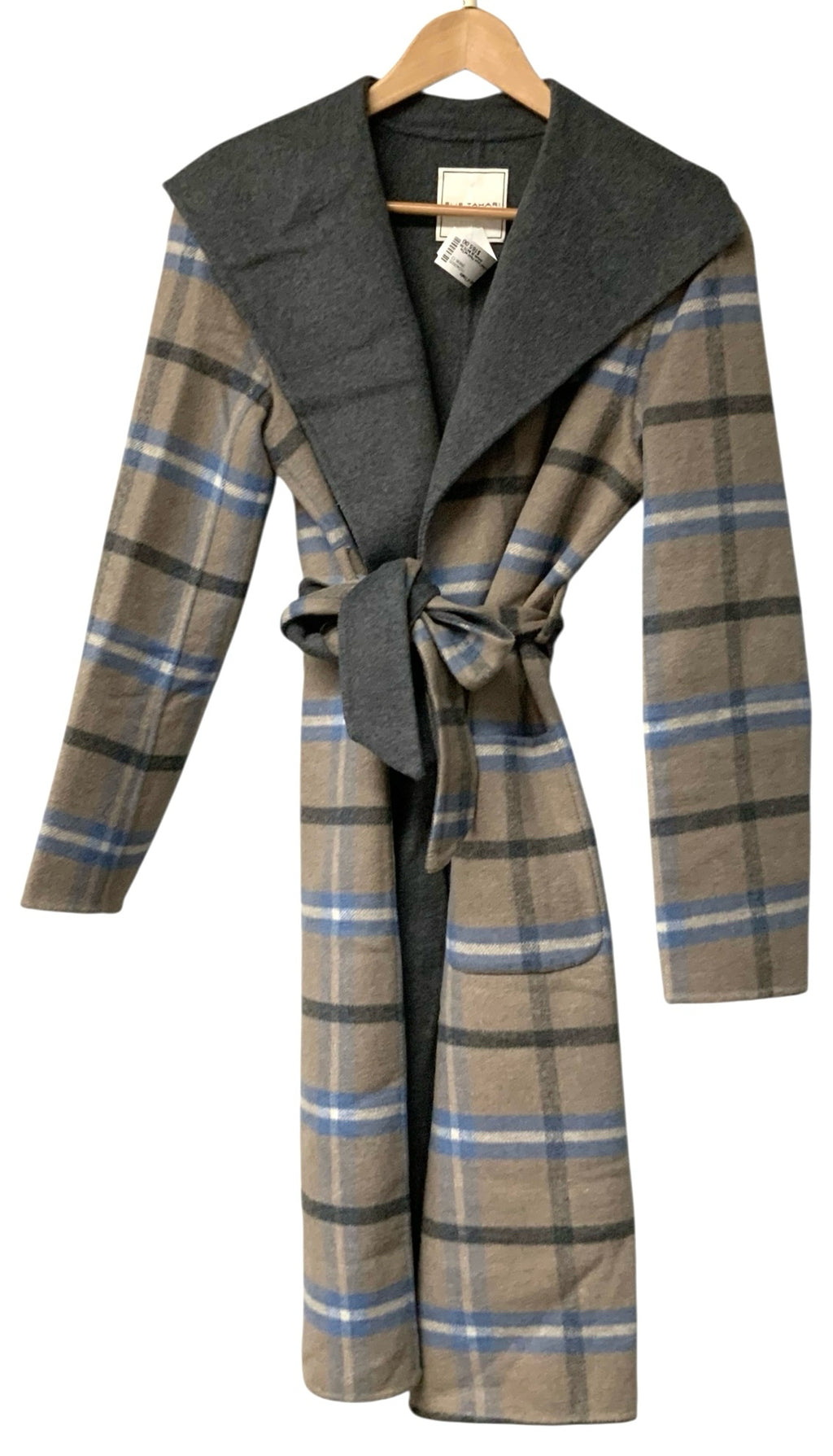 E TAHARI Grey/Blue/Taupe Plaid w/Tie Belt Coat
