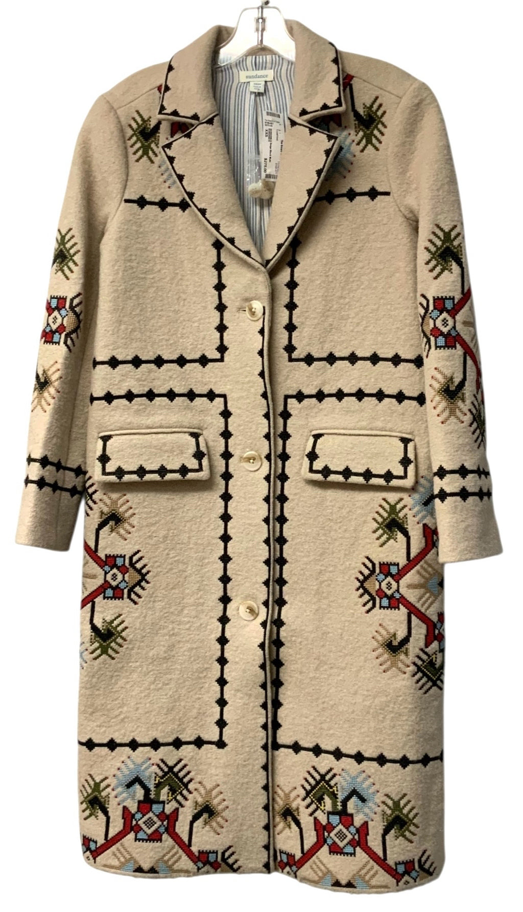 SUNDANCE Beige Black Multi Southwest Embroidered Wool Long Coat