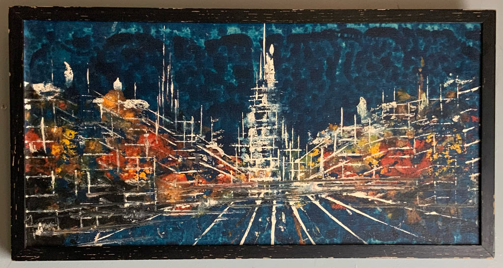 Painting of Skyline, Mid Century, Wood Frame, 25"wx13"h