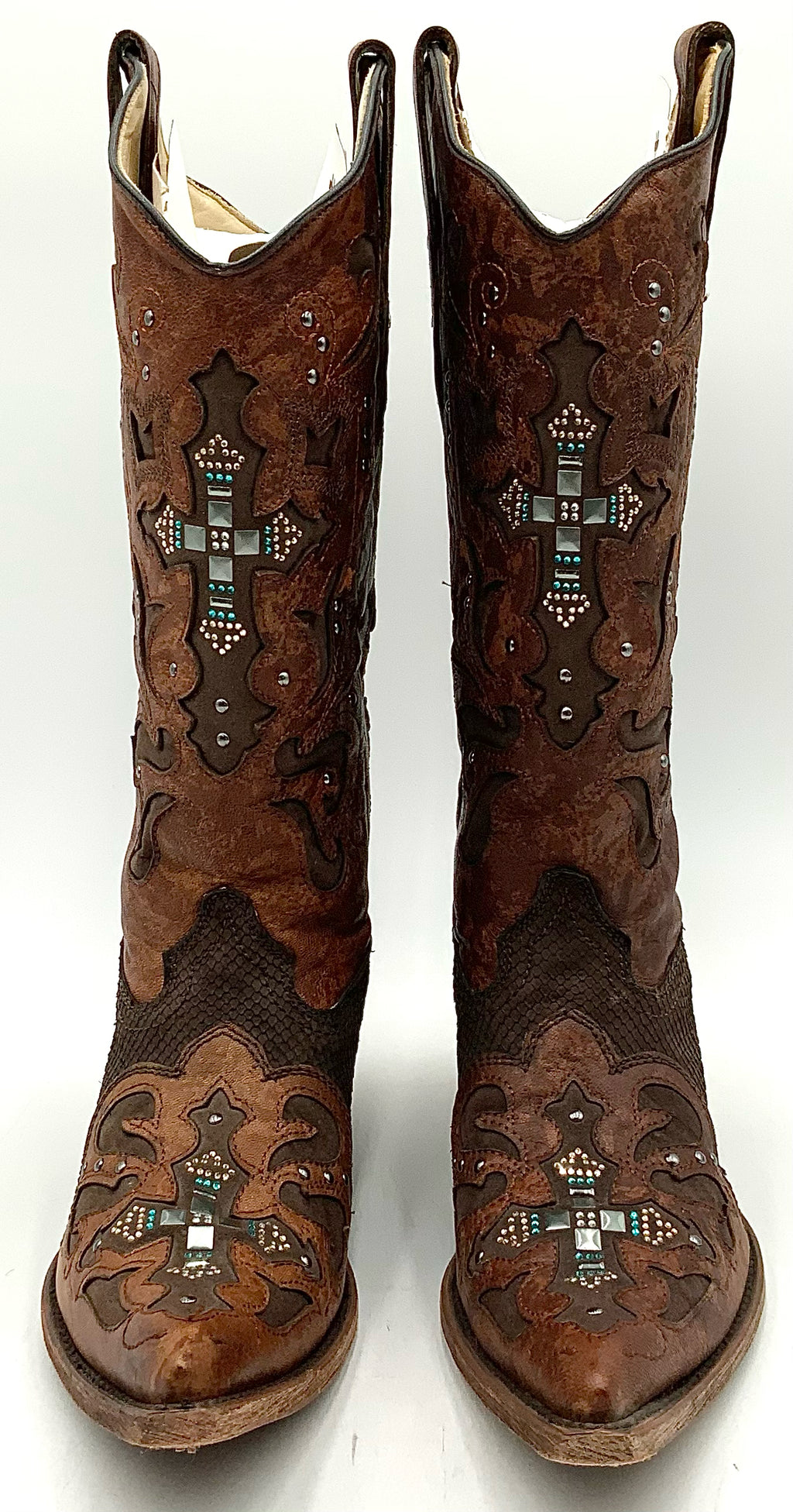 CORRAL Brown Leather & Python Crystal Cross Snip Toe Western Boots Boots 9