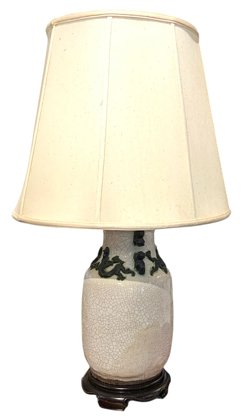 Lamp, Craquelure, Black Salamander Design, Ceramic, Wood Base, (1 of 2 Consigned), 18"wx33"h