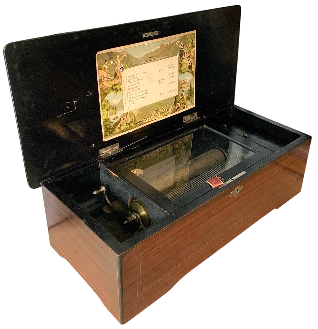 Music Box, Antique, Swiss, Rosewood Case, Inlay, 19"wx9"dx6"h