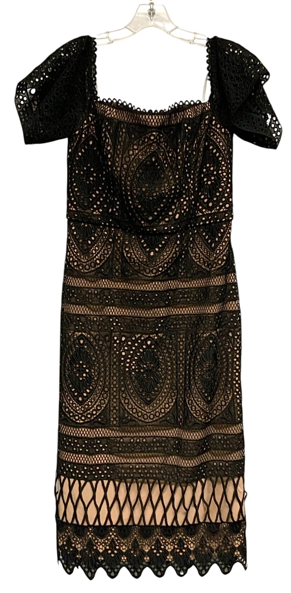 ML MONIQUE LHUILLIER Nude w/Black Lace Overlay Square Neck S/S Dress