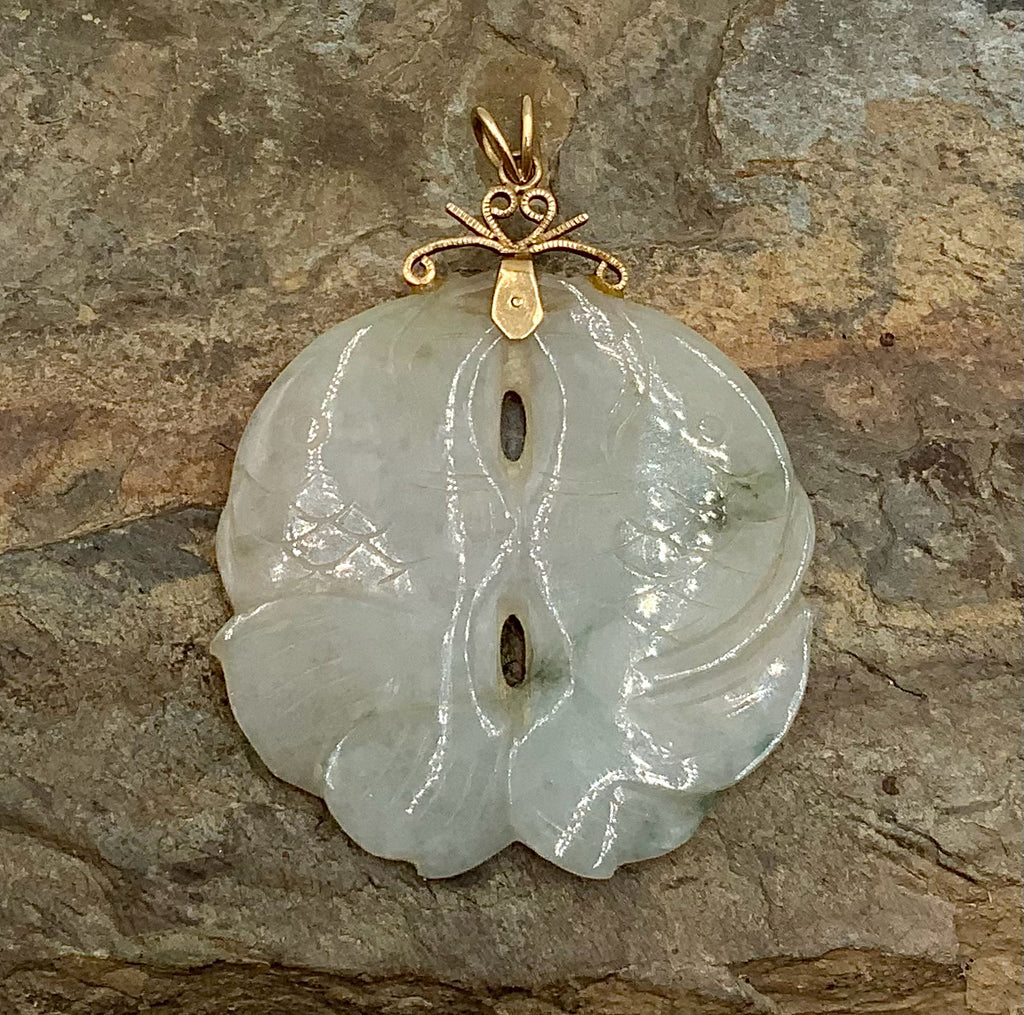 Pendant, 14kt Gold, Jade. Carved Jade Koi Fish (2 Fish) Motif, 2"wx2.625"l. 14kt Gold Bail. Unmarked, Tests as 14kt Gold. 22.1g. (Note-Includes 1 Surface-Reaching Fracture.)