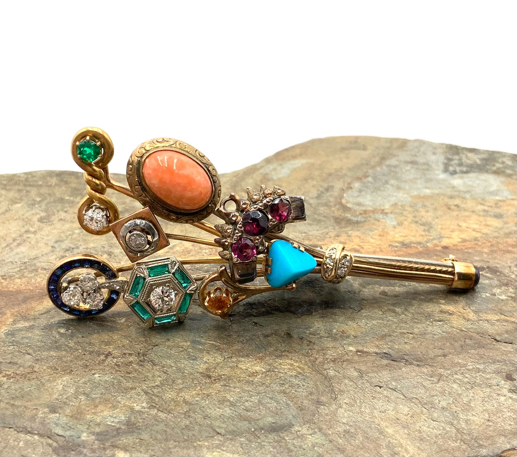 Brooch, 18kt & 14kt Gold, Multi-Gem. 12 Diamonds (3.5-1mm rnd ea) .50 ct.t.w.; 1 Pink Coral (11.5x8x5mm Oval); 1 Turquoise (7x6.5x4mm); 4 Rubies; 1 Synthetic Emerald, 6 Natural Emeralds, 16 Sapphires. 17.9g. (More Details in Appraisal.)