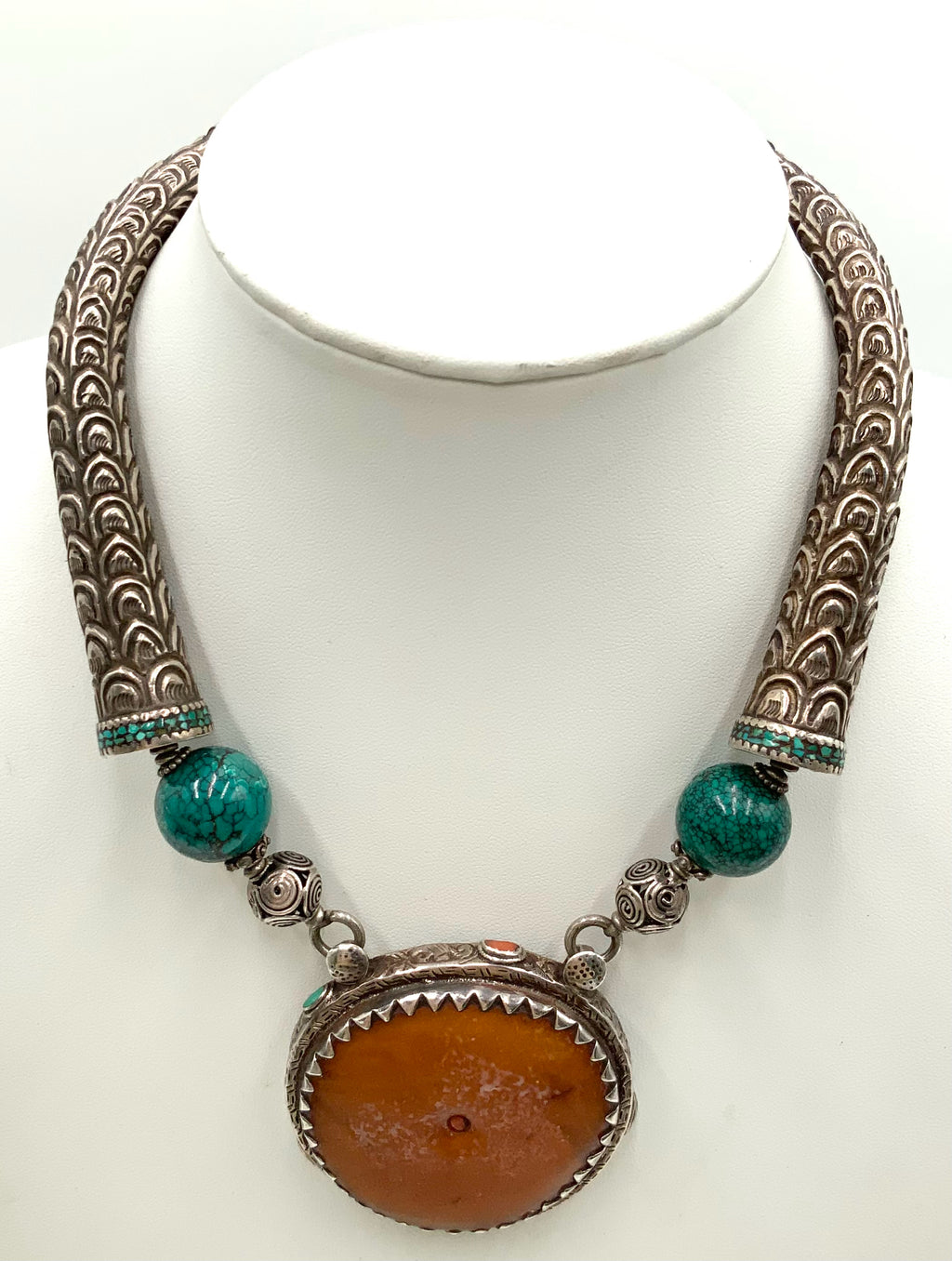 Necklace, Sterling, Amber, Coral, Turquoise. 3 Turquoise Beads, 4 Coral Beads, 10 Sterling Beads, Toggle Clasp, 17.25"l. Pendant, Sterling, Amber, Turquoise, Coral. 2.375" rnd. Unmarked, All Silver Metal Tests as Sterling. 133g.