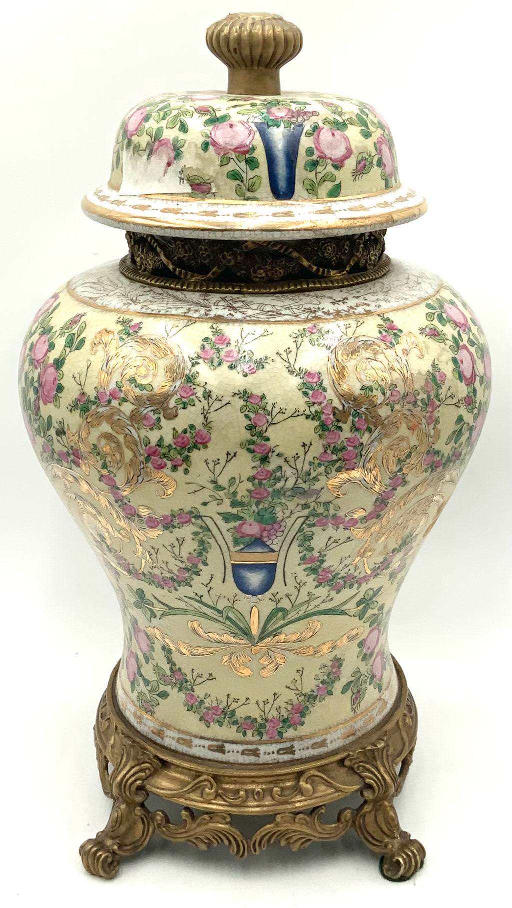 Lidded Ginger Jar, Famille Rose, Asian, Ceramic with Brass Accents, 12"rndx18"h
