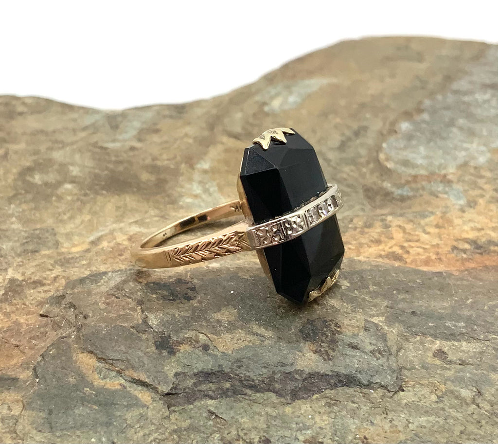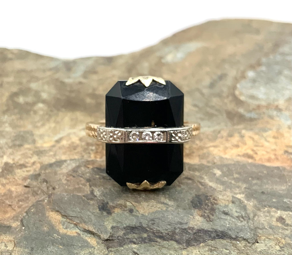 Ring, 10kt Gold, Diamond, Onyx. 1 Onyx (16.5x12x3mm Emerald cut) 4 cts; 6 Diamonds (1.5mm rnd ea) .09 ct.t.w. Size 5.75. Marked 10K. 4.2g.