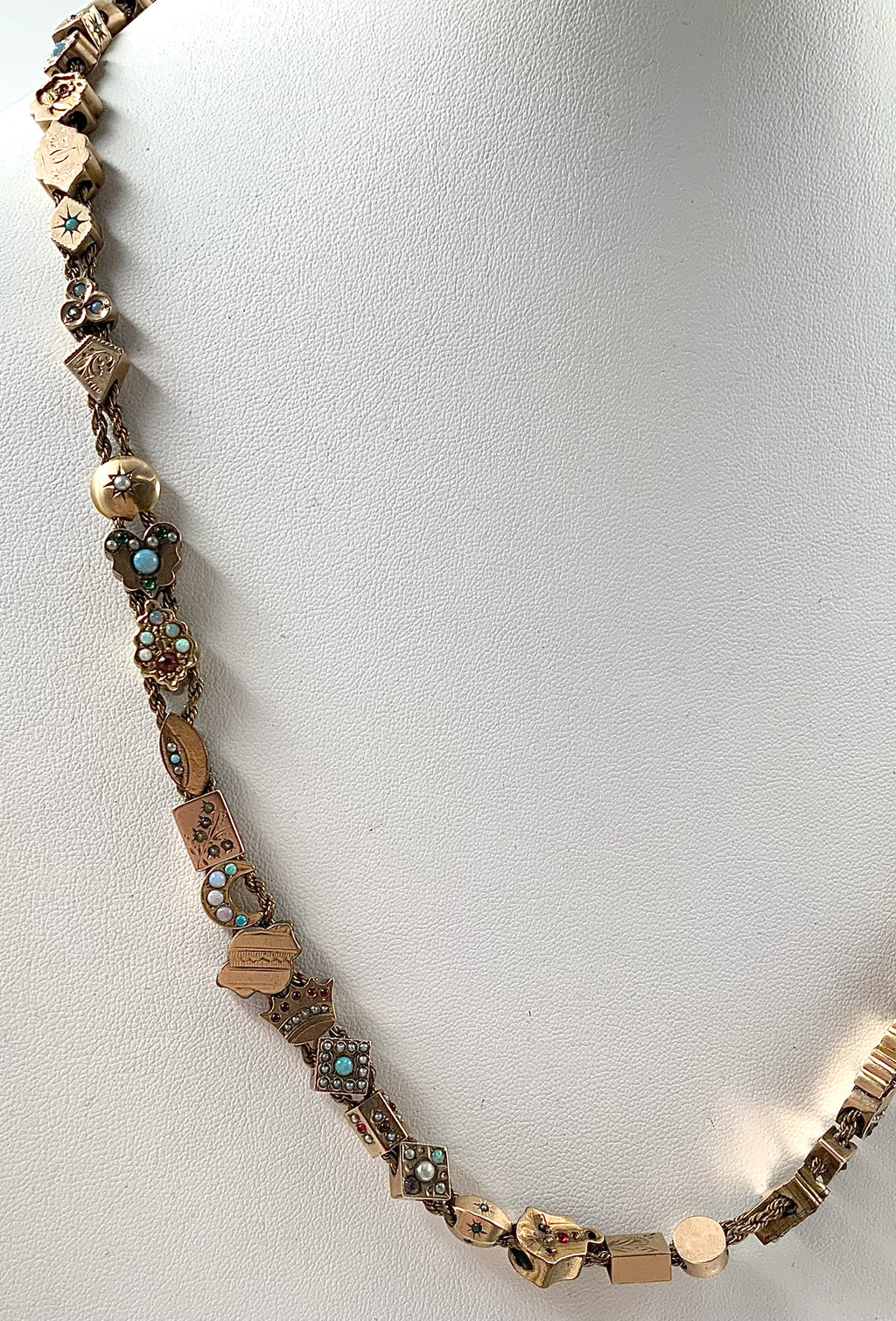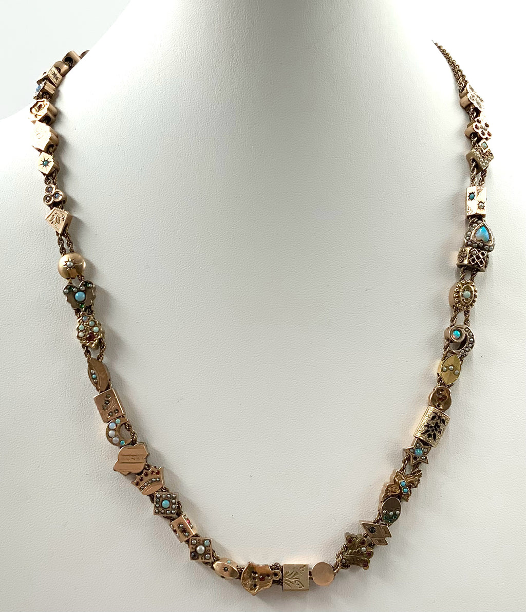 Necklace, 14kt/10kt Gold, Diamond, Sapphire, Opal, Pearl, Ruby, Citrine, Garnet, Turquoise. 1 14kt Gold Slide Contains 1 Sapphire/1 Opal; 43 10kt Slides Contain Multi Gems (Previously Listed); Ttl. Gem Wt. 2.0 cts. Adj. Length 24"-26". 55.2g.