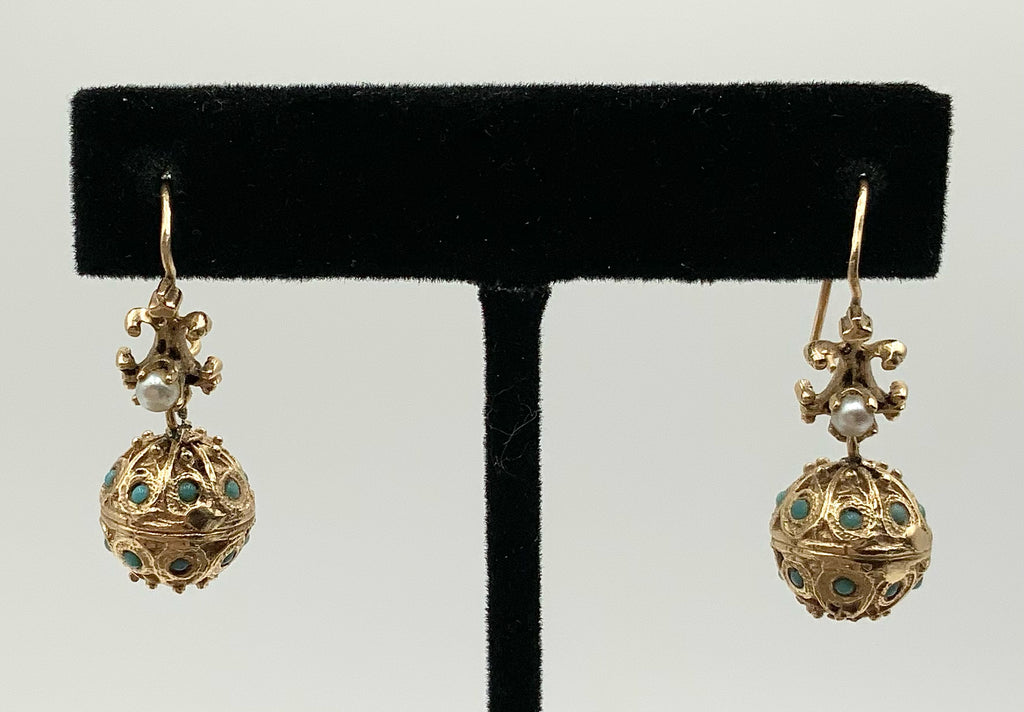 Earrings, 14kt Gold, Glass, Pearl, Ear Wires. 2 Pearls (2.5mm rnd ea), 17 Glass Cabochons (1mm rnd ea). .4375"wx1.25"l. Unmarked, Test as 14kt Gold. 9.6g.