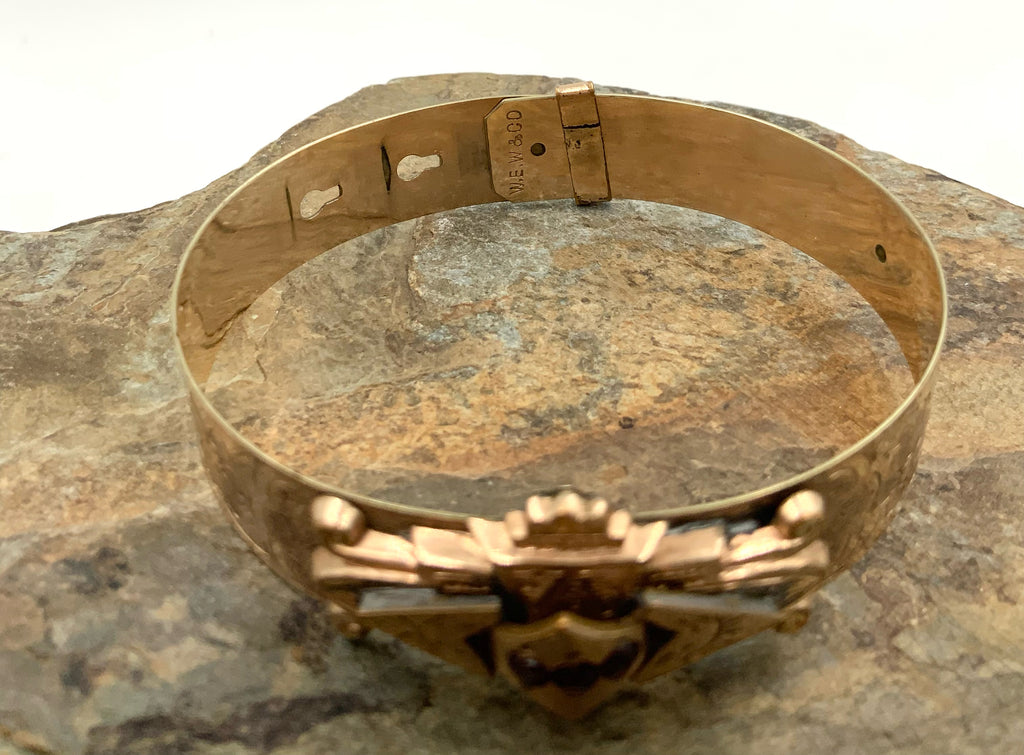 Bracelet, 9kt Gold, Garnet, Bangle. 3 Pyrope Garnets (3mm rnd ea) .30 ct.t.w. Adjustable Inner Circumference/Length 5.5"-6.5". Engraved Floral Decoration. Tests as 9kt Gold, Marked W.E.W &CO. 10.9g.