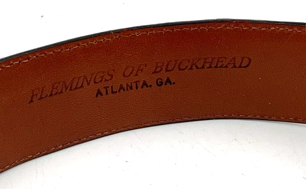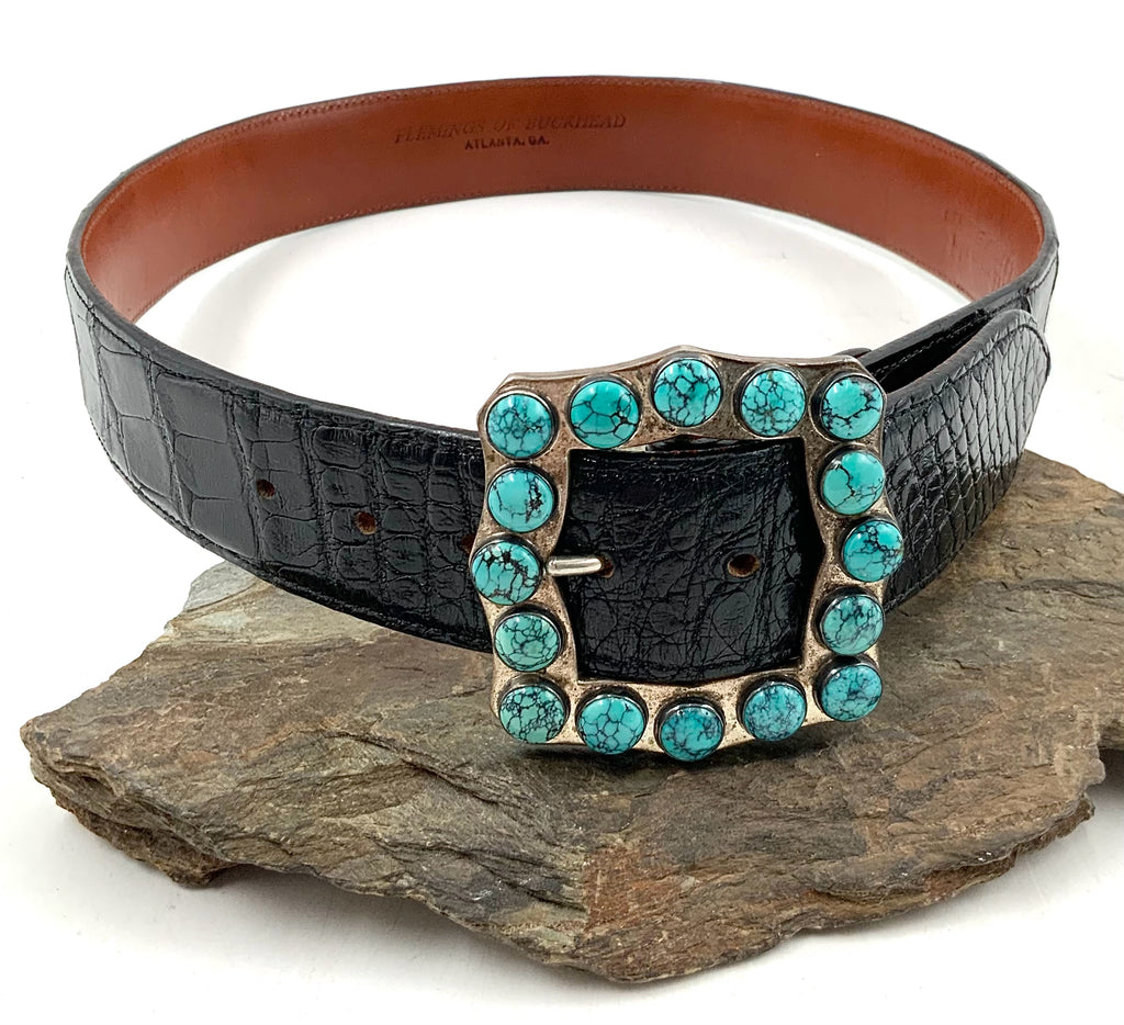Belt, Sterling/Turquoise Buckle, Black Alligator Belt. Buckle is 2.75"wx2.75"l; Marked STERLING (C)DOUGLAS MAGNUS SANTA FE 1994. Belt is Adjustable Length 28"-31"; Width 1.5". Marked FLEMINGS OF BUCKHEAD ATLANTA, GA. Buckle wt. 108g.