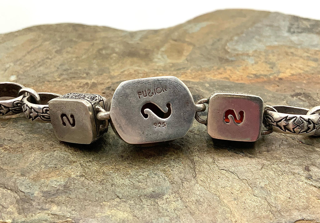 Bracelet, Sterling, Ruby, Garnet. 1 Ruby, 4 Garnets, Stamped Link Chain, Toggle Clasp, 7.5"l. Marked FUSION 925. 45g.
