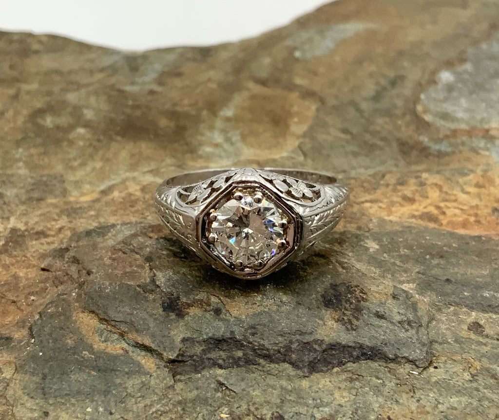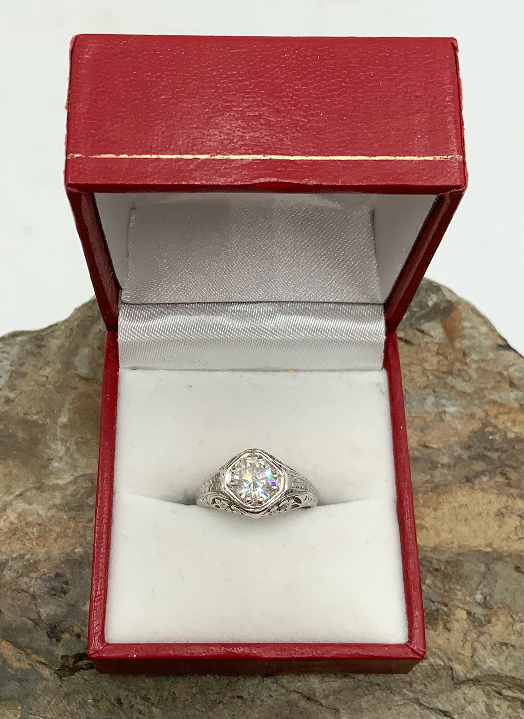 Ring, Platinum, Diamond. 1 Diamond (7.00x3.50mm rnd) .90 cts. Size 6.25. Marked PLATINUM. 3.3g.