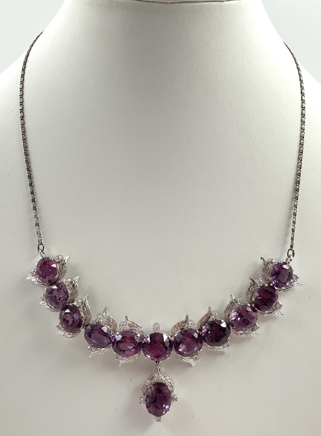 Necklace, Sterling, Silvertone Metal, Amethyst, CZ. 12 Amethysts, 24 CZs, Lobster Clasp, 21"l. Unmarked, Chain/Clasp Test as Sterling, Rest of Silver Metal Tests as Silvertone. 43.1g. Comes w/Box.