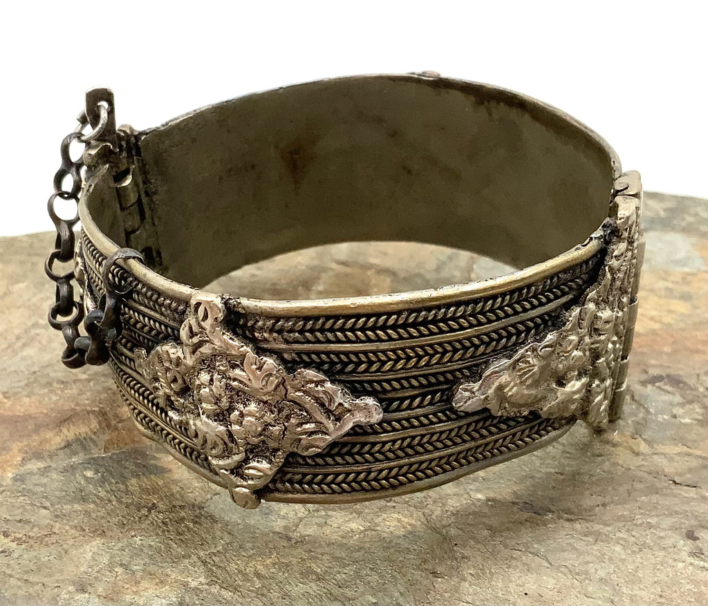 Bracelet, Sterling, Silvertone. Inner Circumference 7". Hinged w/Pin Lock Closure. Unmarked; Base Tests as Silvertone Metal; Applied Floral Silver Decoration & Pin Lock Test as Sterling. 79.2g.