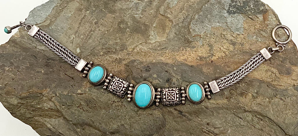 Bracelet, Sterling, Turquoise. Herringbone Chain/Links, 3 Turquoise, Toggle Clasp, 8"l. Marked 925A CHINA. 30.8g.