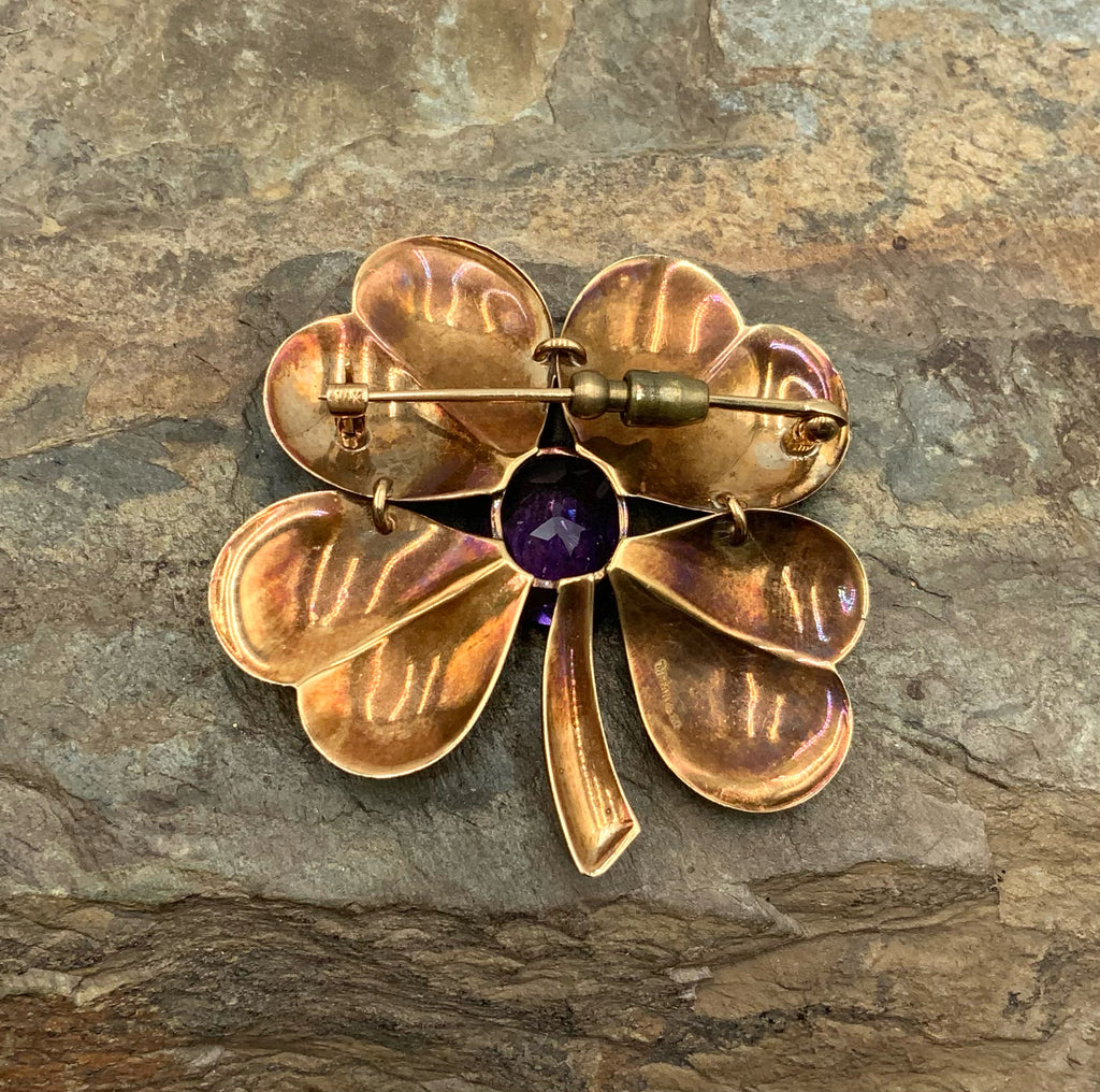 Brooch, 14kt Gold, Amethyst. 1 Amethyst (11x13mm Oval cut). 1.875"wx1.875"l. Marked 14K TIFFANY & CO. 14.8g.