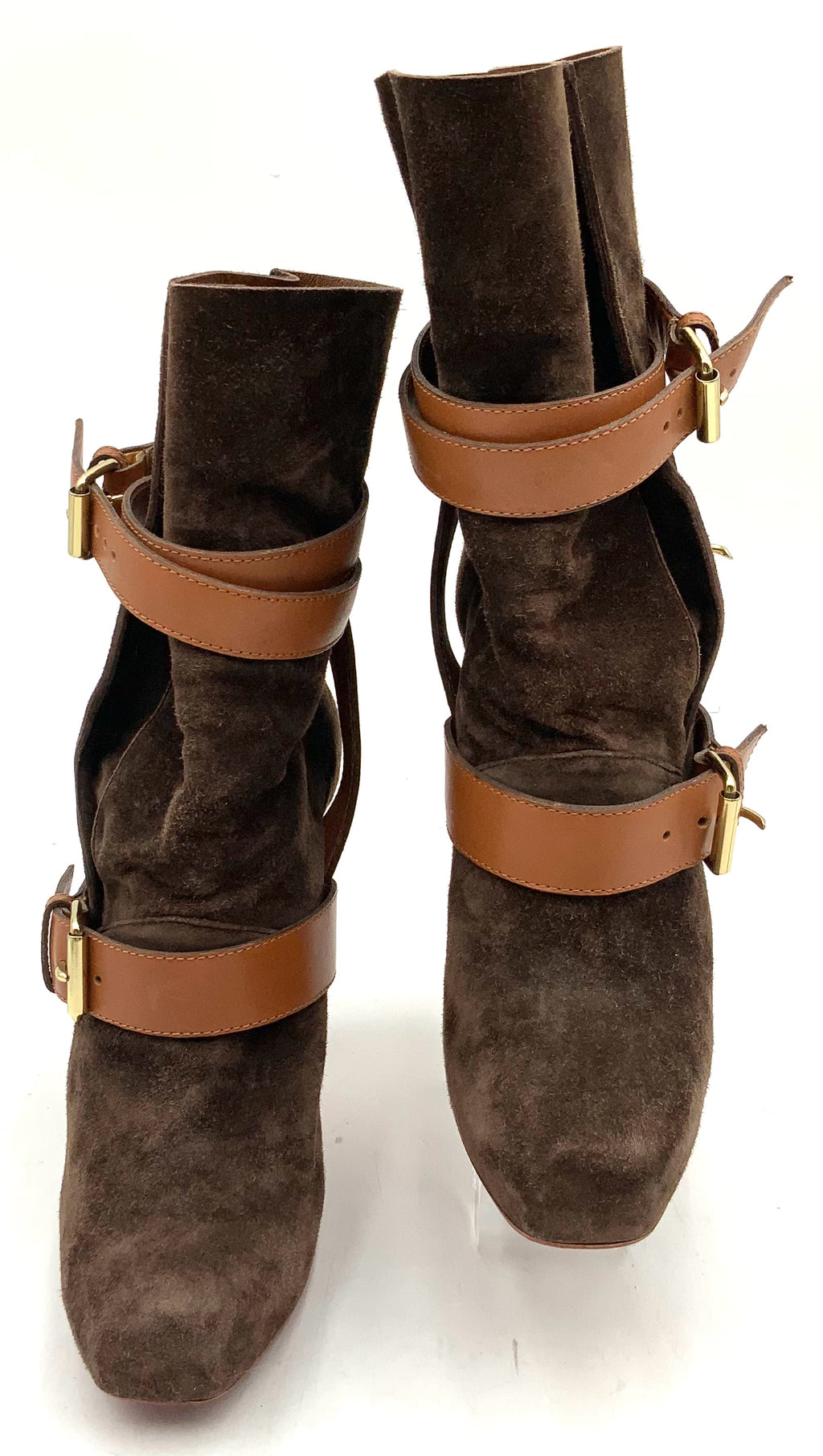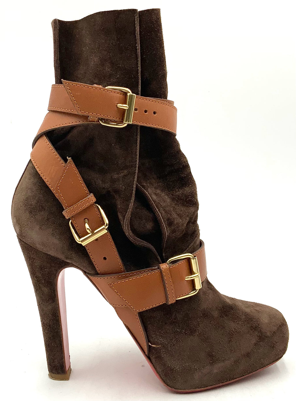 CHRISTIAN LOUBOUTIN Brown Suede Tan Leather Ankle Wrap Buckle Guerriere H/H Booties 39. These have been re-soled for improved traction/grip.