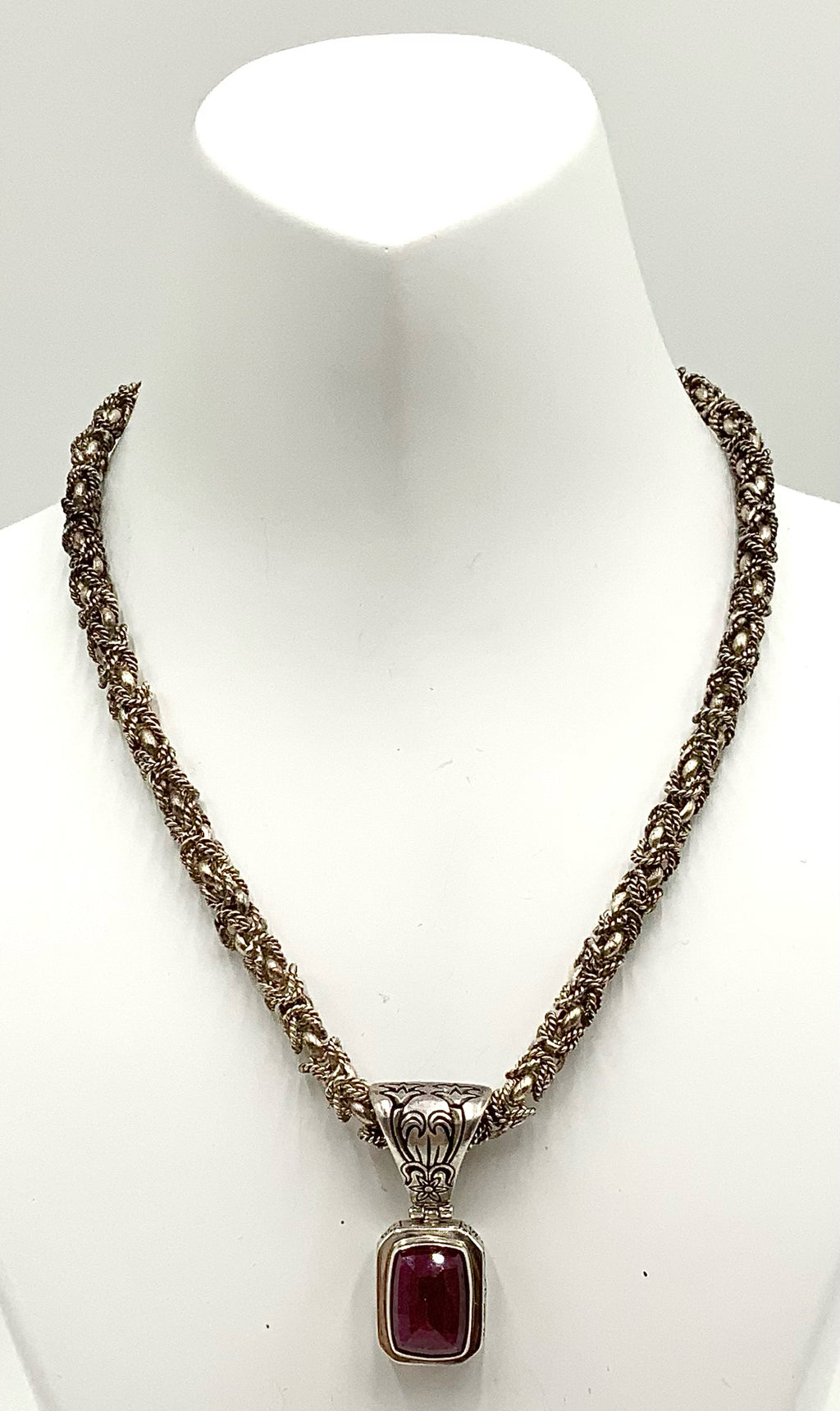 Necklace, Sterling, Ruby. Byzantine Style Chain, Toggle Clasp, 16"l. Pendant, Sterling, Ruby. .5"wx1.375"l. Marked FUSION 925. 56.4g. Comes w/Box.
