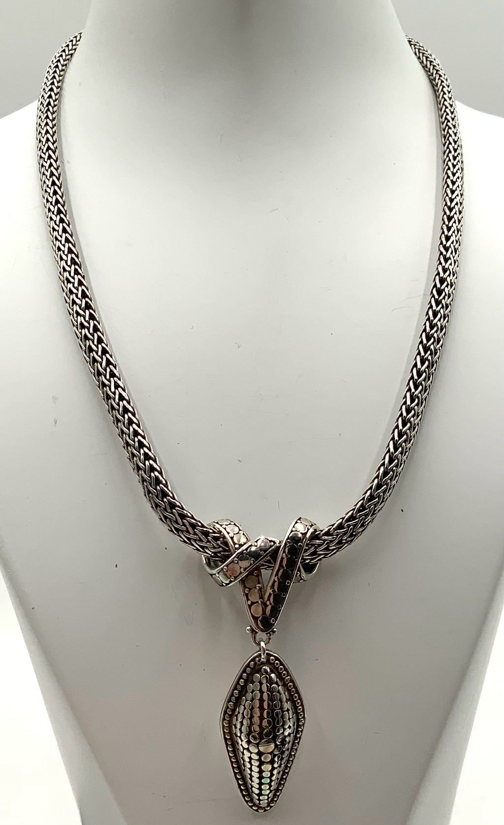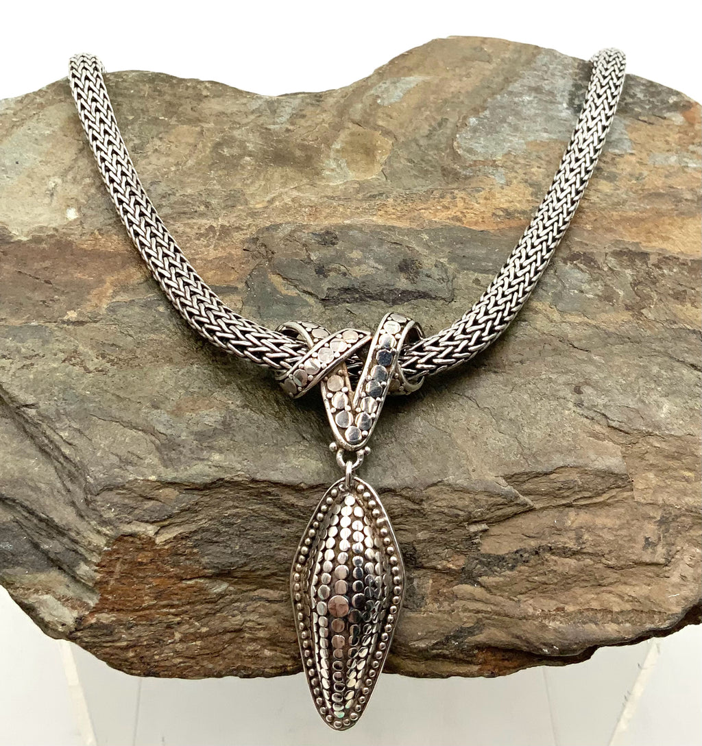 Necklace, Sterling. Woven Wheat Chain, Hidden Box Clasp, 18"l. Pendant, Sterling, Slide. 1"wx2.375"l. Marked w/John Hardy Logo Mark & 925. 71.5g. Comes w/Box.