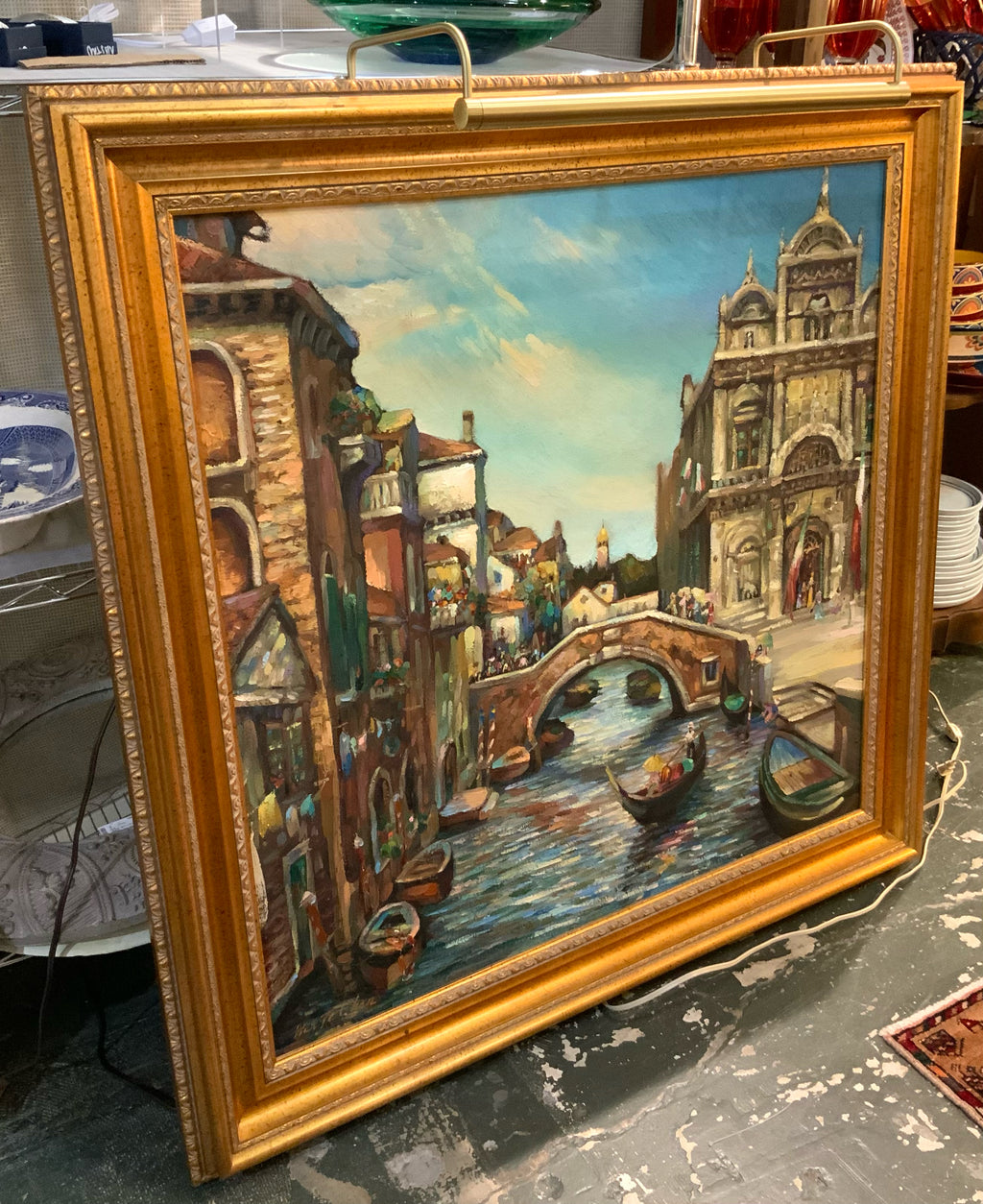 Oil on Canvas, Wen Ze Chen, "Morning Light in Venice", Gold Frame, Picture Light, 36"sq