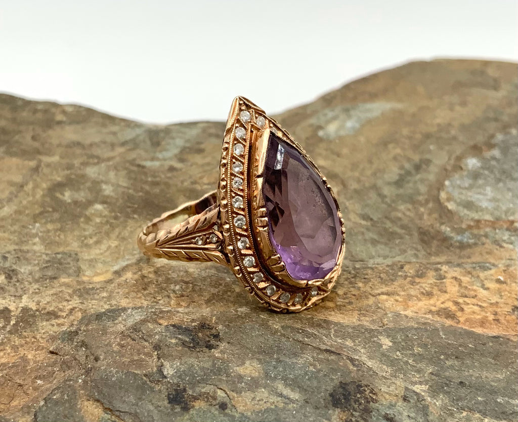 Ring, 14kt Gold, Diamond, Amethyst. 1 Amethyst (15x9.5x6mm Pear shaped) 3.75 cts; 30 Diamonds (1.5mm rnd ea) .50 ct.t.w. Size 5. Unmarked, Tests as 14kt Gold. 4g.