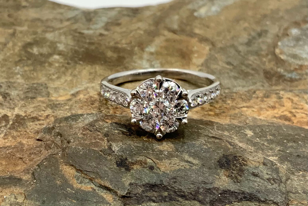 Ring, 14kt Gold, Diamond. 1 Diamond (3.75mm rnd) .18 cts; 6 Diamonds (3.25mm rnd ea) .12 ct.t.w.; 10 Diamonds (1.75mm rnd ea). Total Diamond wt: 1.00 cts. Size 5.75. Marked 14K C83-1. 2.3g.