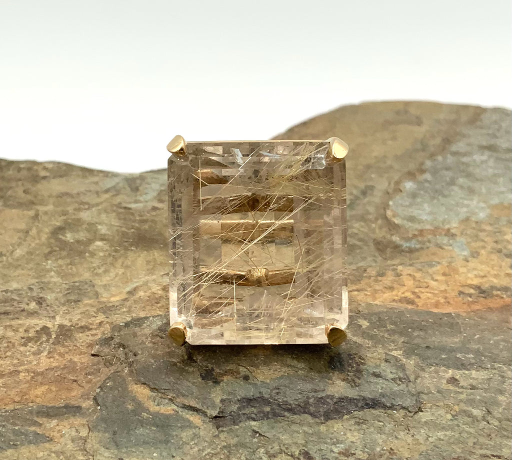 Ring, 14kt Gold, Rutilated Quartz. 1 Rutilated Quartz (19x22mm Rectangular Cut). Size 8.75. Marked F (C) 96 14K. 14.9g.