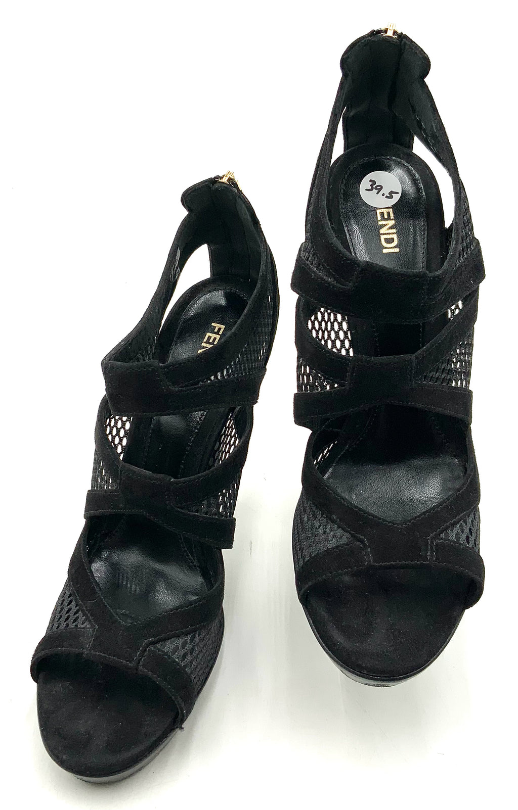 FENDI Black Suede & Noir Mesh Platform Heels Sandals 39.5