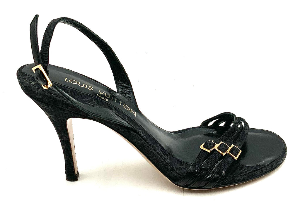 LOUIS VUITTON Black Monogram Fabric Triple Buckle Stiletto Sandals 38.5. Made in Italy.
