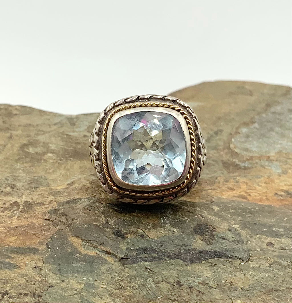 Ring, 14kt Gold, Sterling, Blue Topaz. 1 Blue Topaz (12x12mm sq). Size 5.75. Marked INDO 14K (Twisted Wire Accent Around Bezel); All Silver Metal Tests as Sterling. 17g.