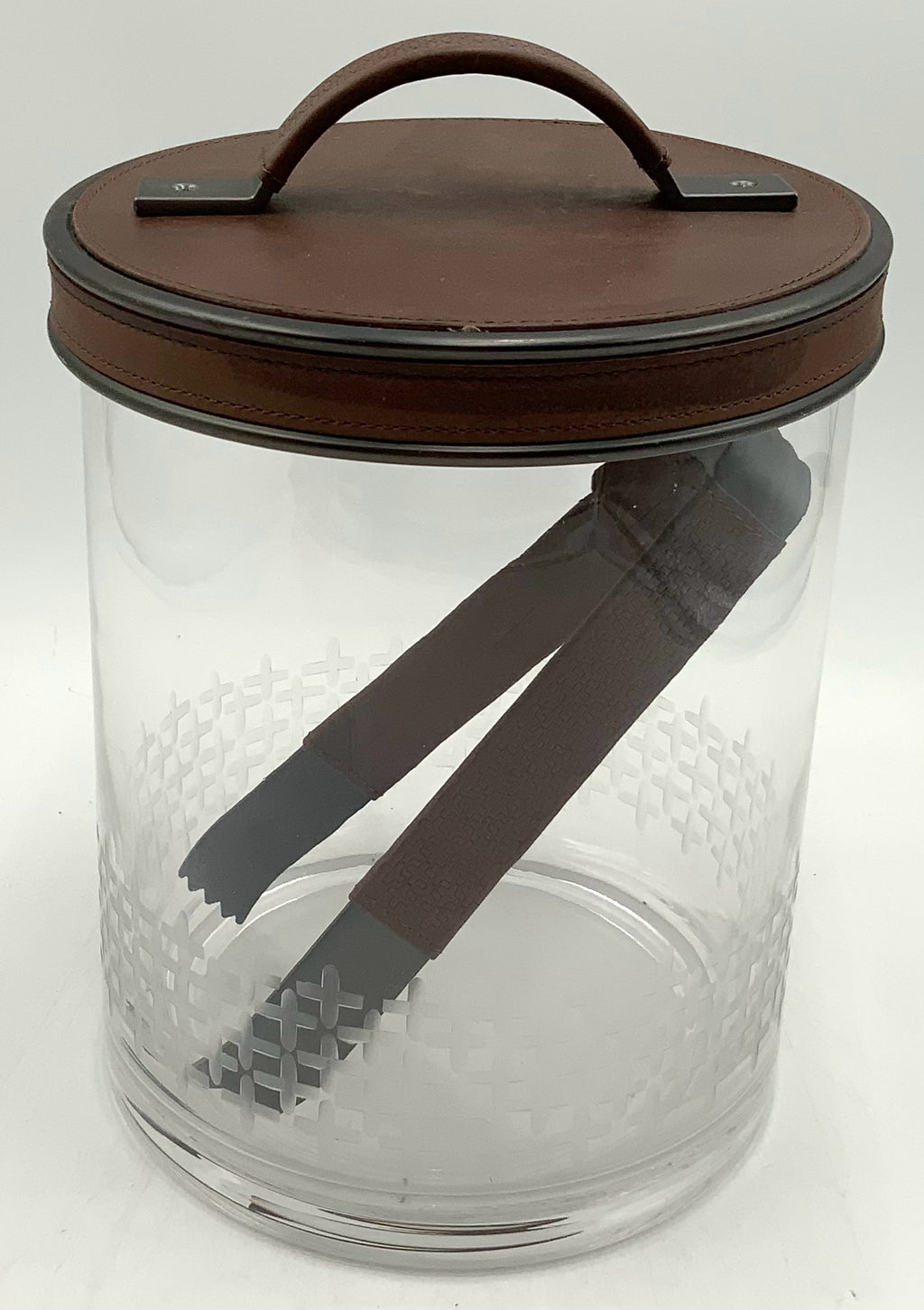 Glass Ice Bucket With Tongs, Leather Accents, 8"rndx11"h