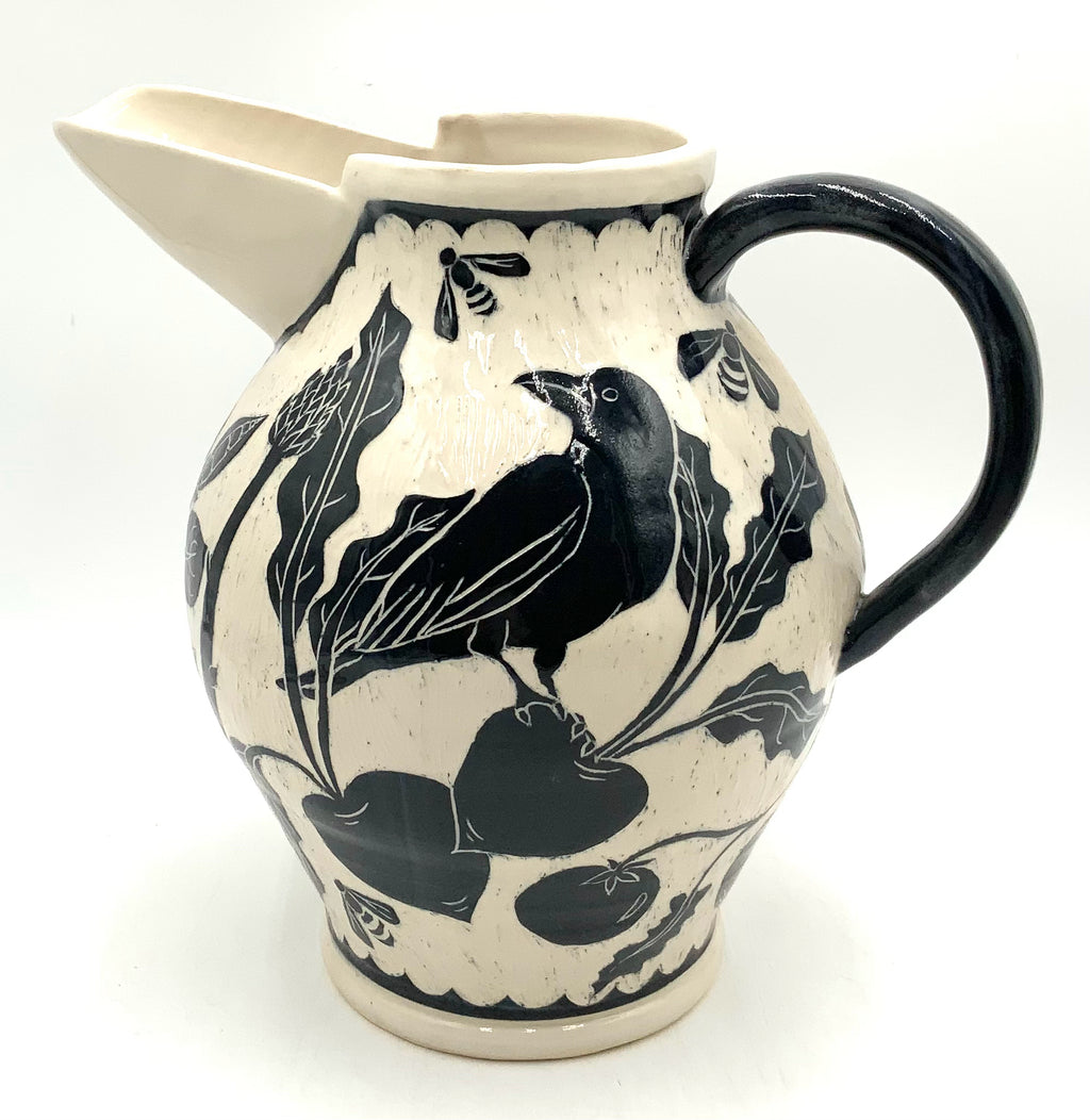 Pitcher, Saraffito, Pottery, Black/White, Crow Motif, 12"wx12"h