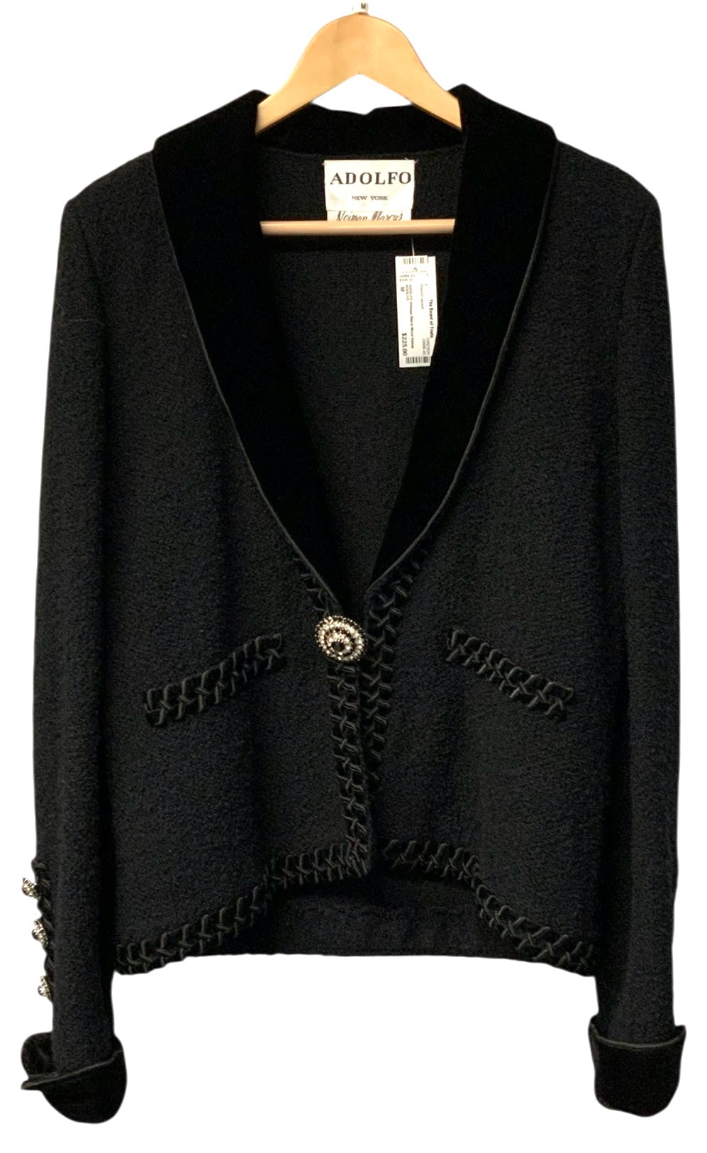 ADOLFO Vintage Black Wool Velvet Trim Rhinestone Button Jacket