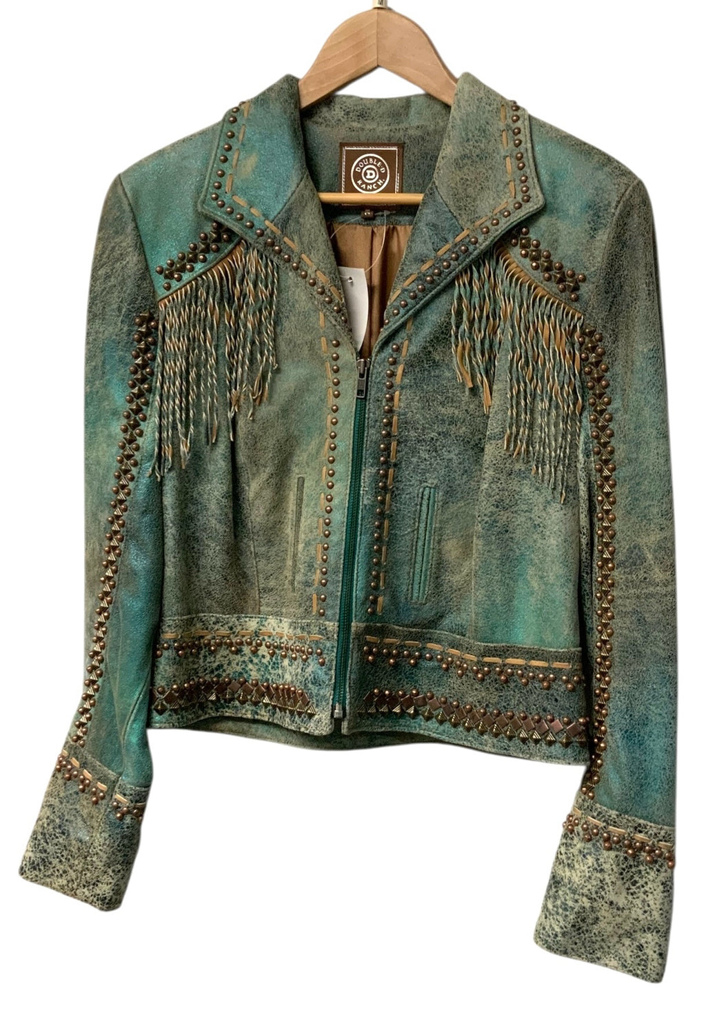 Double D Ranch Verdi Gris Distressed Lea Twist Fringe Copper & Brass Stud Jacket