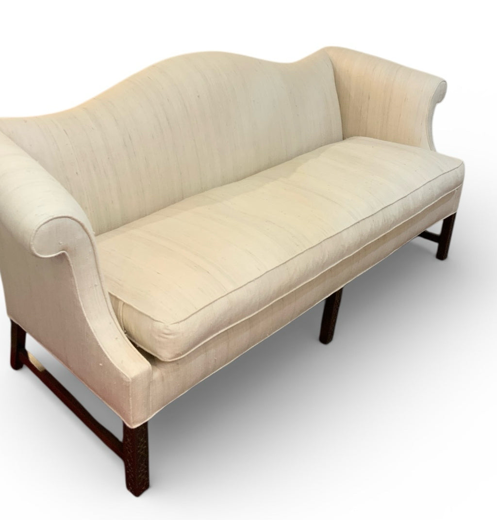 Camelback Sofa, Ivory Silk Shantung, Down Cushion, 75"wx29"dx34"h; 20.5" Seat Height