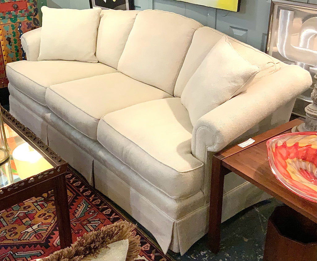 Sofa, Roll Arm, Neutral Tweed Upholstery, Camelback, Skirted, Loose Seat Cushions, Attached Back Cushions, Two Throw Pillows, 82"wx31"dx32"h; 17" Seat Height