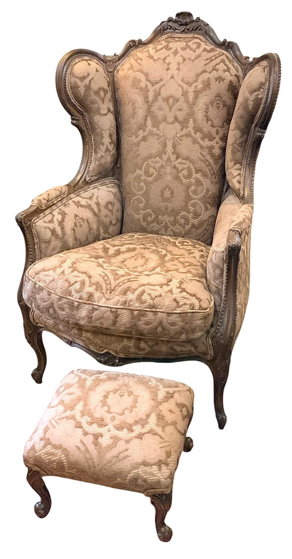 Vintage Carved Wood Wing Chair And Footstool with Brown Flocked Upholstery