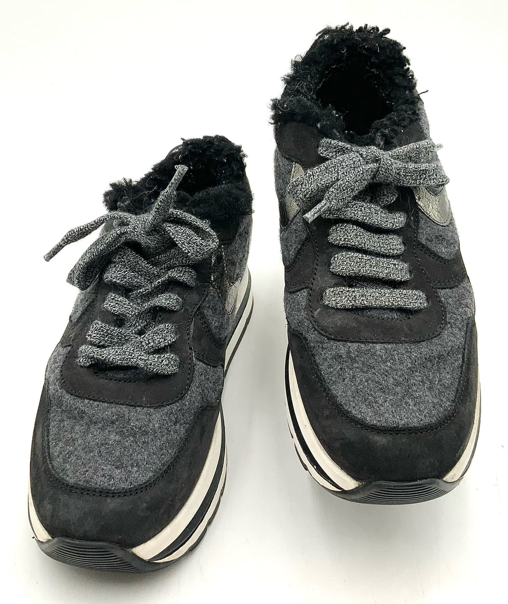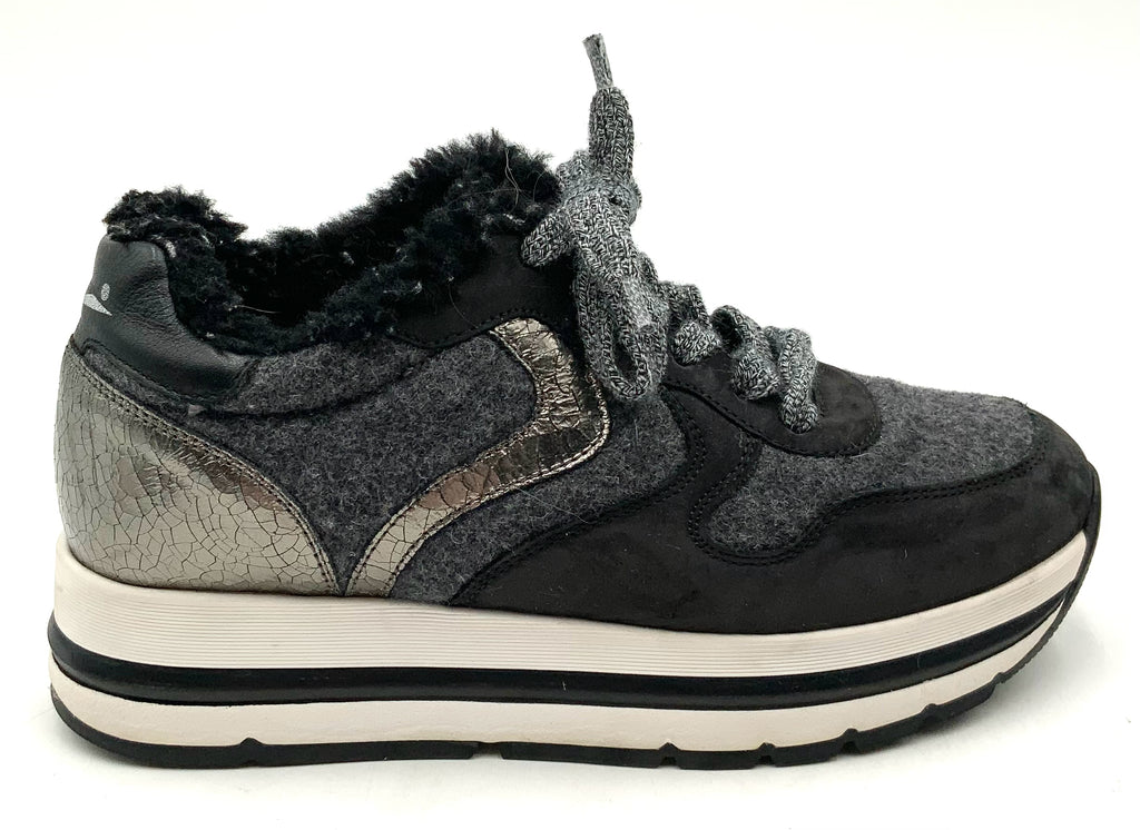 VOILE BLANCHE Black Suede Grey Felt Black Shearling Maran Platform Sneakers 37