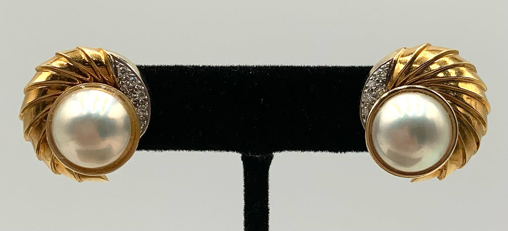 Earrings, 14kt Gold, Pearl, Diamond. Earrings: 2 Mabe Pearls (13mm rnd). Earring Jackets: 18kt Gold Electroplate, 12 Diamonds (1.75mm rnd ea) .24 ct.t.w. Assembled Size .875" rnd. Earrings Marked 585; Jackets Marked 18K GP. 19.4g.