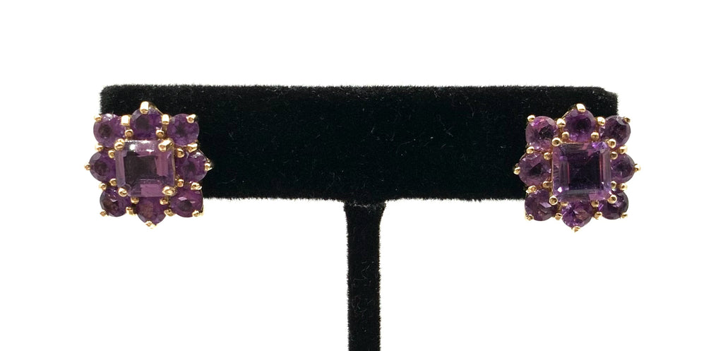 Earrings, 14kt Gold, Amethyst, Posts/Omega Backs. 18 Amethysts (3.5mm rnd ea-6x6mm Emerald cut). .5625"wx.5625"l. Marked 14K NF (All Metal Incl. Mounting/Posts/Omega Clips is 14kt Gold). 5.6g.