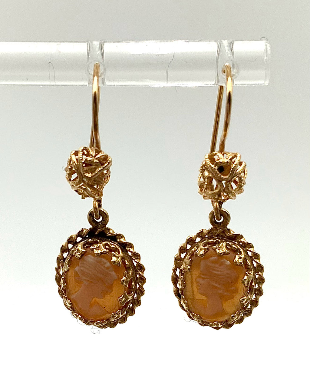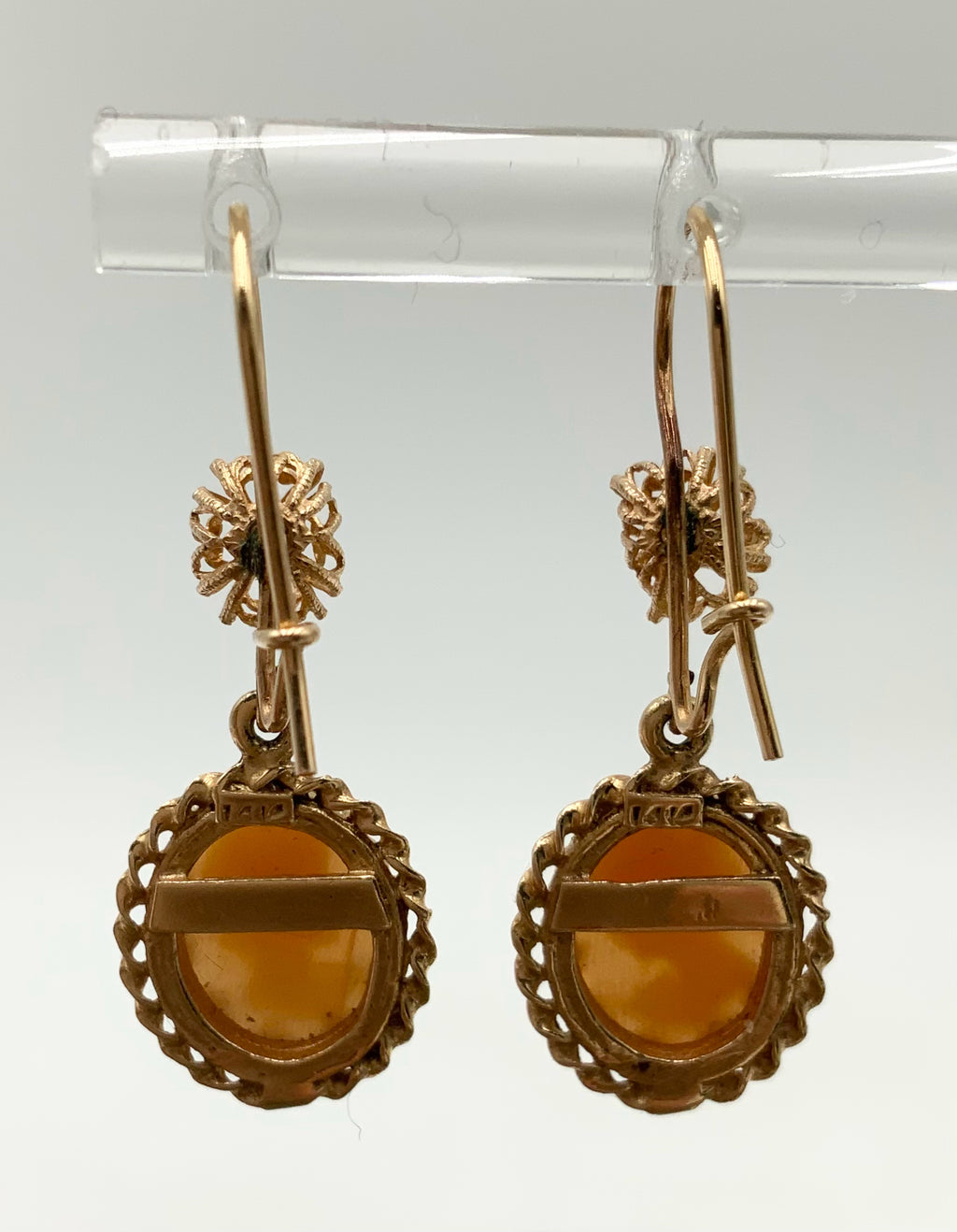 Earrings, 14kt Gold, Shell, Ear Wires. 2 Carved Shell Cameos (8x11mm Oval). .4375"wx1.3125"l. Marked 14K. 3.7g.