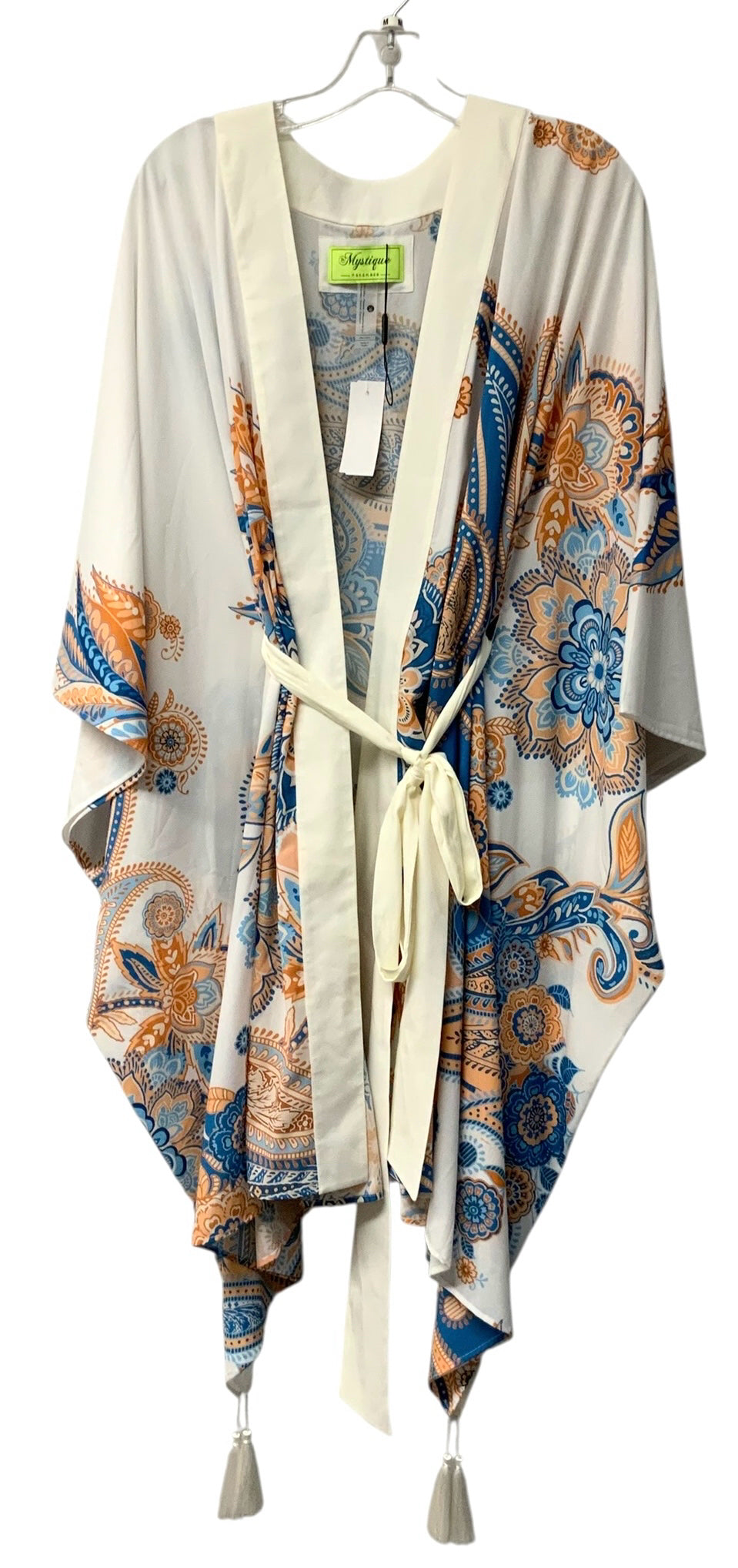 MYSTIQUE Handmade Ivory Blue Orange Paisley Floral Chiffon Belted Kimono