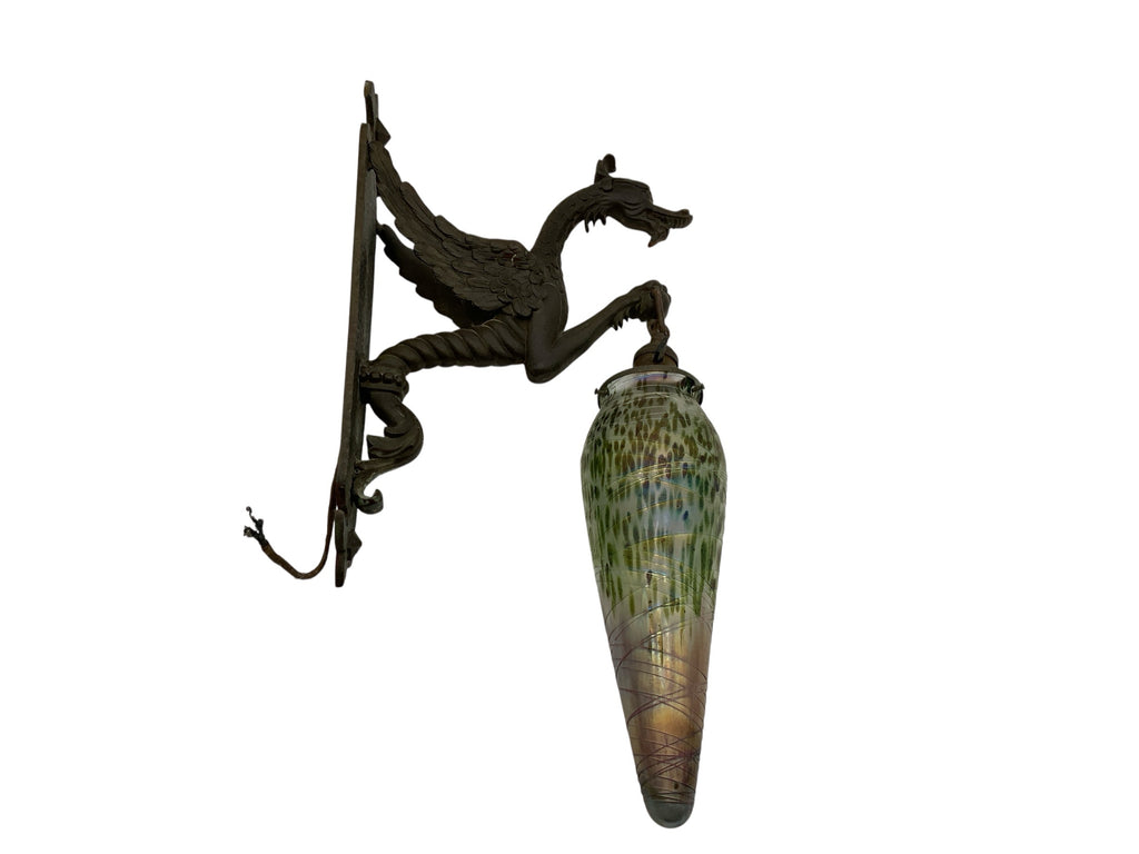 Wall Sconces, Pair, Iron, Griffin Motif, Electric, Vintage, Art Nouveau Glass Shades, 4.5"wx12"dx27"h In Working Condition
