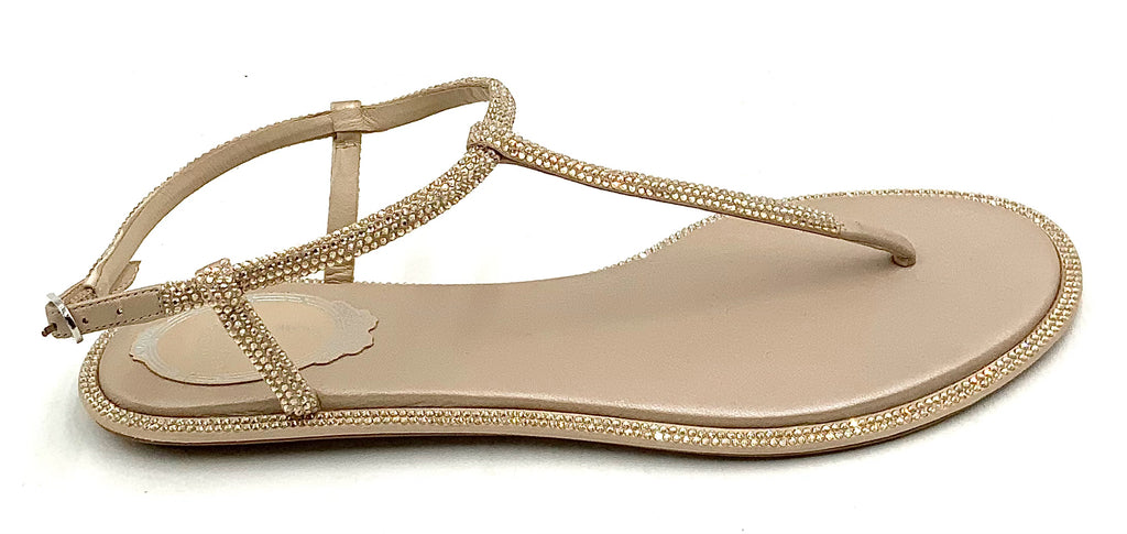 RENE CAOVILLA Beige Leather Swarovski Crystal Strass T Strap Flat Sandals 39. Made in Italy. Missing one crystal on back left shoe.