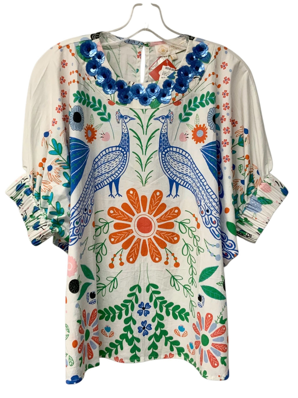 White/Orange/Blue Floral w/Sequin Flowers Top