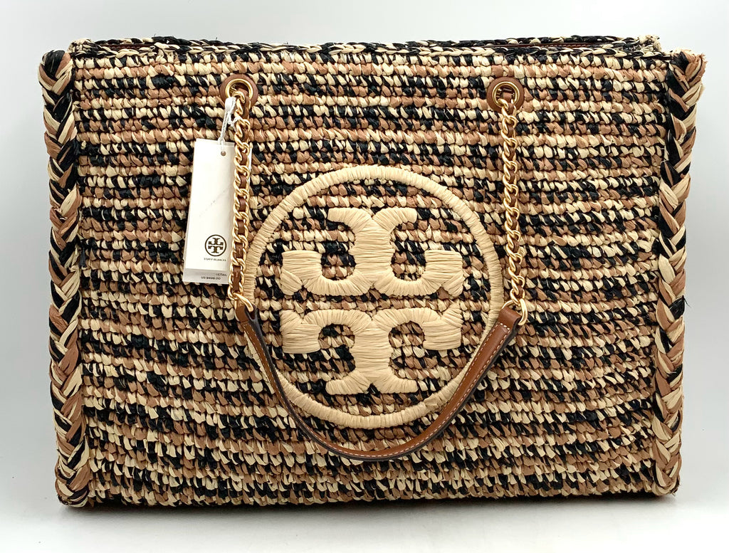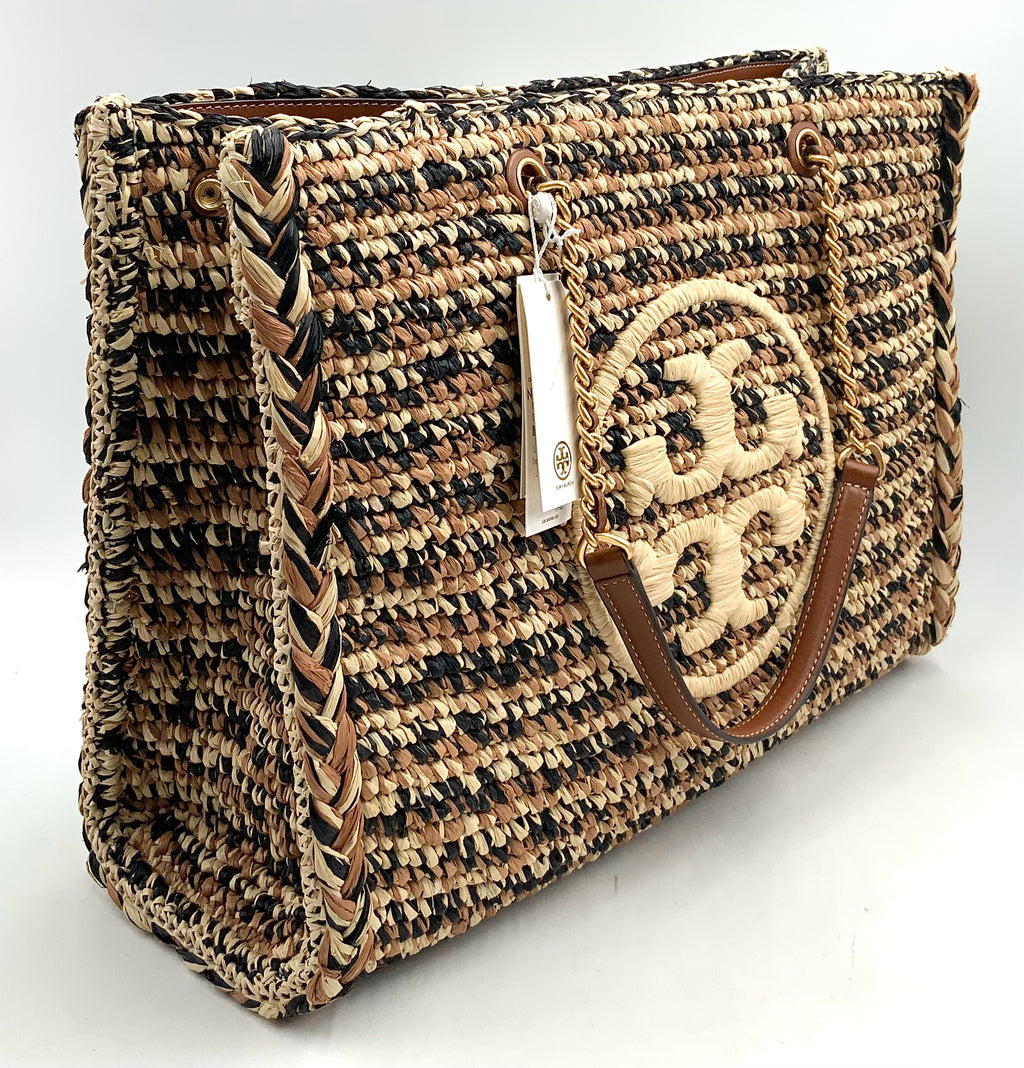 TORY BURCH Natural Tan Black Raffia Ella Chain Strap Tote. Includes detachable brown leather zip pouch.