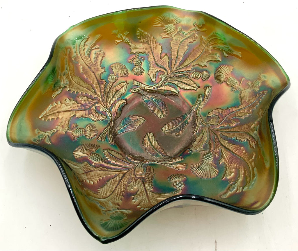 Thistle Bowl, Carnival Glass, Vintage, Ruffled Edge, 9"rnd